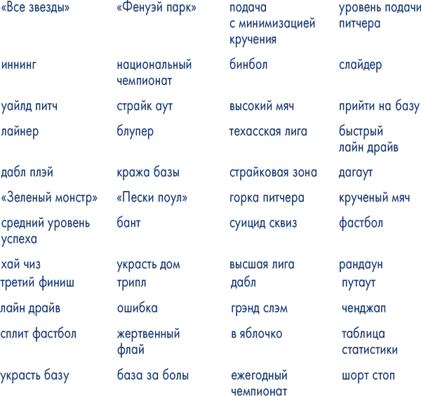 Если бейсбол – это не тот вид спорта, который вас вдохновляет – о котором вы мечтаете, хотите в него играть, смотреть, говорить о нем все время, – то какой вам нравится? Ничто не мешает вам составить ваш собственный список слов из спортивного жаргона. Может быть, вы напишете краткие объяснения ваших любимых спортивных терминов для того, кому они совершенно непонятны, но кто был бы рад вместе с вами посмотреть (или даже сыграть), если бы знал правила.