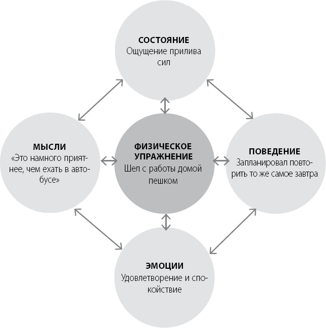 Заполните интеллект-карту, приведенную на странице слева, выбрав одно из выполненных упражнений из дневника. Сконцентрируйтесь на том, как чувствовали себя физически и эмоционально, что думали после его выполнения, – и что подвигло вас на его совершение. Не посетила ли вас мысль: «Мог бы я сделать это снова?» (мысли), когда вы поднимались по лестнице в квартиру (поведение), испытывая чувство гордости (эмоции)?