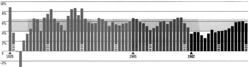 А теперь посмотрим, что произошло за семнадцать лет начиная с 1982 года? Чего не произошло – это достойного роста ВВП: за этот второй 17-летний период ВВП увеличился менее чем в три раза. Но процентные ставки начали снижаться, и после того как эффект Волкера сгладился, доходы начали расти – не постоянно, но тем не менее с реальной силой. Вы увидите тенденцию дохода в графике, который показывает, что к концу 1990-х доходы после уплаты налогов как процент ВВП приближались к 6 %, что находится в верхней части определения «нормальной обстановки». К концу 1998 года долгосрочные правительственные процентные ставки снизились до 5 %.