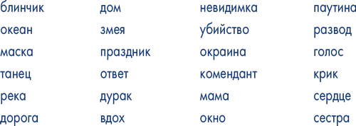 Слово-позвоночник не обязательно должно соотноситься по смыслу с тем, о чем вы пишете (хотя и может). Когда вы экспериментируете с акростихом, сделайте вдох и выдох, расслабьтесь, позвольте словам литься и танцевать быстро или медленно (долго или коротко), как им самим нужно. Вот несколько слов для тренировки.