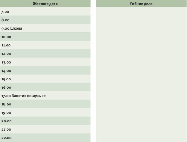 Затем мы уходим на музыку и возвращаемся только в 19.00. С 19.00 до 22.00 у нас остается еще 3 часа (считаем, что в 22.00 все дела должны быть завершены). Таким образом, всего в левой части у нас есть 5 свободных часов.