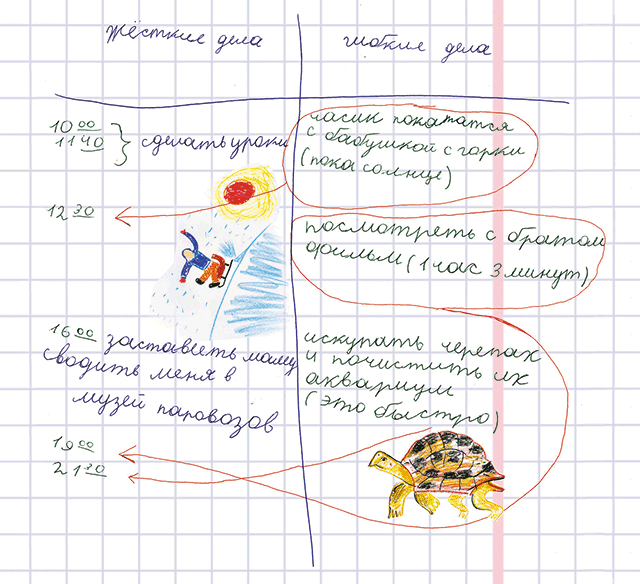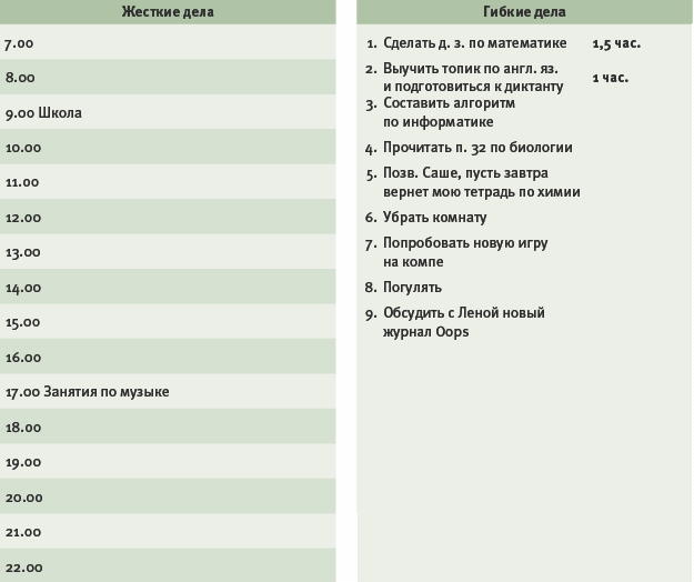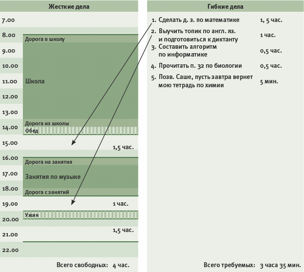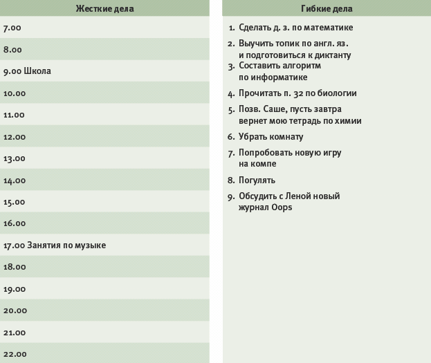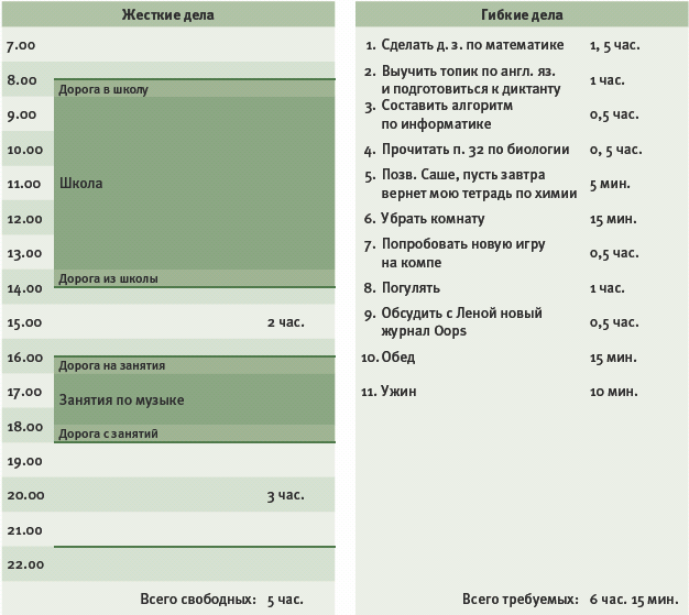 Нашим детям день кажется невероятно длинным: они, разумеется, успеют все – выполнят домашние задания, погуляют, поиграют в компьютерные игры. Но при этом их время изобилует жесткими делами. В младших классах и основной школе это уроки и кружки, в старших добавляются подготовительные курсы и репетиторы. И по факту на выполнение гибких дел остается совсем мало времени, и это время должно быть организовано так, чтобы успеть сделать все необходимое. К тому же возникают спонтанные дела – поручения взрослых, новые незапланированные домашние задания.