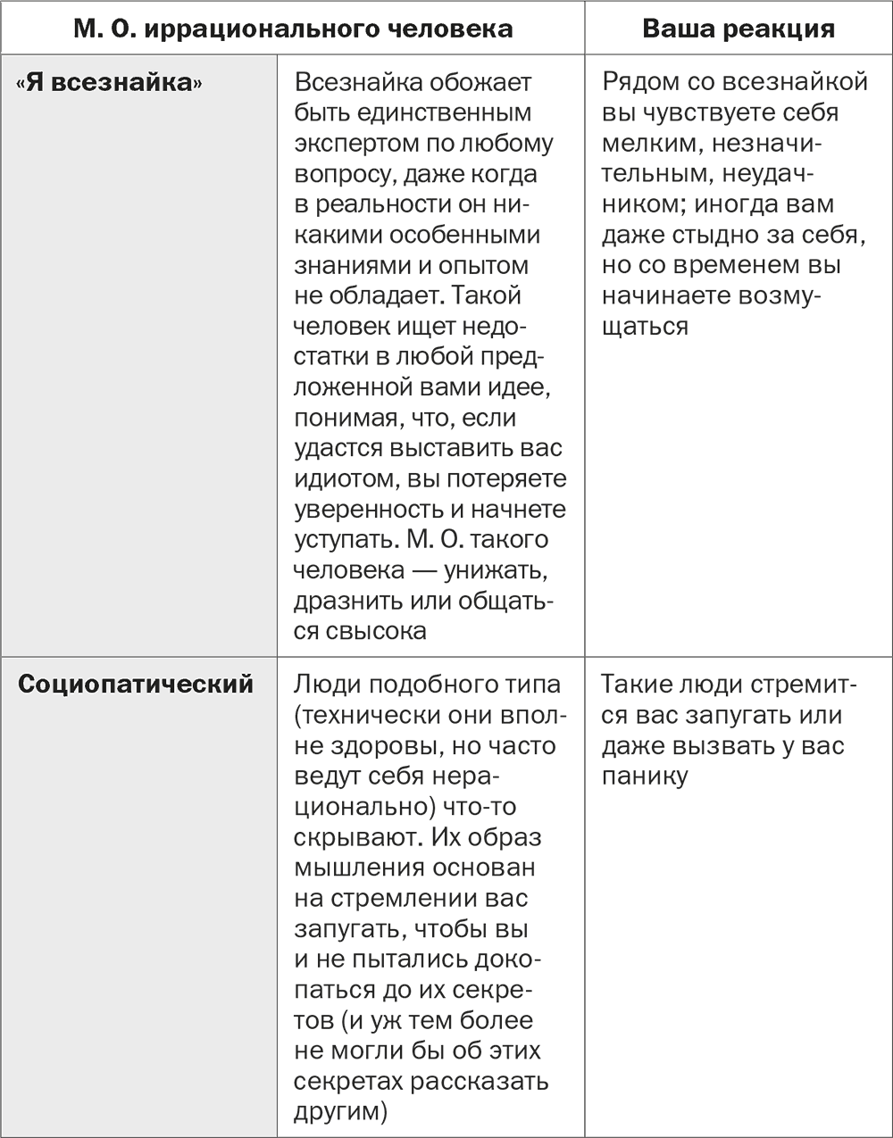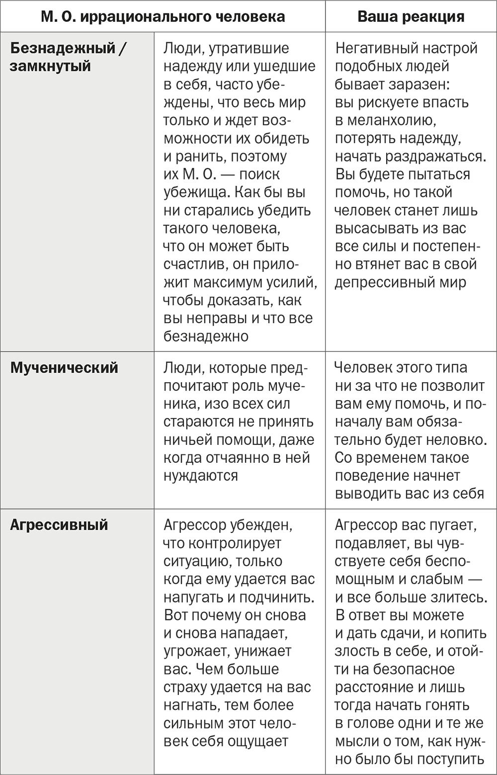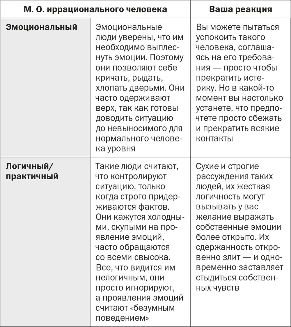 Разобравшись с тем, какого именно типа М. О. использует иррациональная личность, вам будет проще осознать, что все эти истерики, холодность, нытье, замкнутость или агрессия не имеют особого отношения лично к вам: подобным поведением ваш визави пытается восстановить ощущение контроля над ситуацией. Как мы скоро увидим, понимание типа М. О. помогает выбрать наиболее разумную линию поведения.
