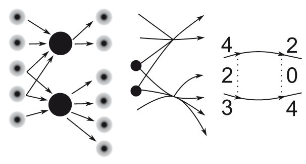 Рис. 3.6. Два пучка, связанных через пару нейронов. До и после очистки от структурного шума. Можно пойти дальше и изображать каждый пучок стрелкой и парой чисел. Пунктирные линии — пересечения пучков, то есть общие нейроны на входе (2 штуки) и на выходе (нет таких)