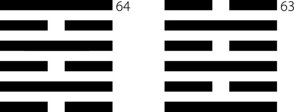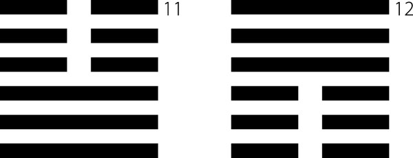 Следующий подход состоит в том, что внутренний знак определяет движение снизу верх, а внешний, соответственно, сверху вниз (имеется в виду отражение направления движения изнутри вовне и извне вовнутрь в пространстве ощутимого мира человеческого существа на плоскость рисунка). Образом этого является знак СОГЛАСОВАННОСТЬ, 11, где вверху располагается знак Земля, а внизу знак Небо. При полном несоответствии, с точки зрения образа мыслей европейца, положения этих образов в знаке он является счастливым, и положение знаков в нем совершенно уместное. Почему? Потому что жизнь есть постоянное изменение, движение. И знаки всегда отражают движение. Поэтому движение Земли вниз и Неба наверх есть проявление движения, соответствующего вечным законам, то есть Земля и Небо движутся навстречу друг другу. А в противоположном знаке, который идет следом в порядке расположения знаков в Книге, знаке НЕСОГЛАСОВАННОСТЬ, 12, Земля находится внизу, а Небо наверху, и, следовательно, движение их направлено в разные стороны и соединения между веществом Духа и веществом ощущения не происходит, потому и возникает образ НЕСОГЛАСОВАННОСТИ.