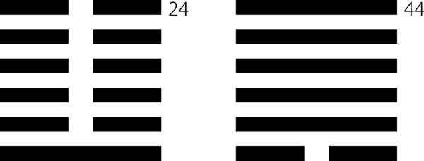 Теперь рассмотрим другой подход. Внутреннее развитие обстоятельств на плоскости отражается как движение с нижнего уровня к верхнему. Это можно сравнить с ростом растения. И сила уровня зависит от рисунка знака. Так, знак ВОЗВРАТ, 24, отличается тем, что единственная янская черта, располагающаяся на нижнем уровне, движется наверх, то есть янская сила нарастает. Знак соотносится с периодом времени, который начинается после зимнего солнцестояния, когда начинает прибывать световой день. Соответственно, противоположностью ему является знак СТОЛКНОВЕНИЕ, 44, в котором внизу располагается иньская черта, то есть иньские силы являются очень мощными. О нем говорится как о ситуации, в которой одна женщина удерживает пятерых мужчин. Он соотносится с периодом после летнего солнцестояния, когда начинается выдох в годичном круге.