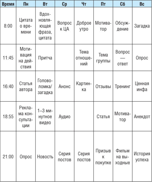 На основе данной информации строится контент-план. Определяется, какие виды постов подходят для данной группы, сколько постов в день нужно будет публиковать и в какое время.