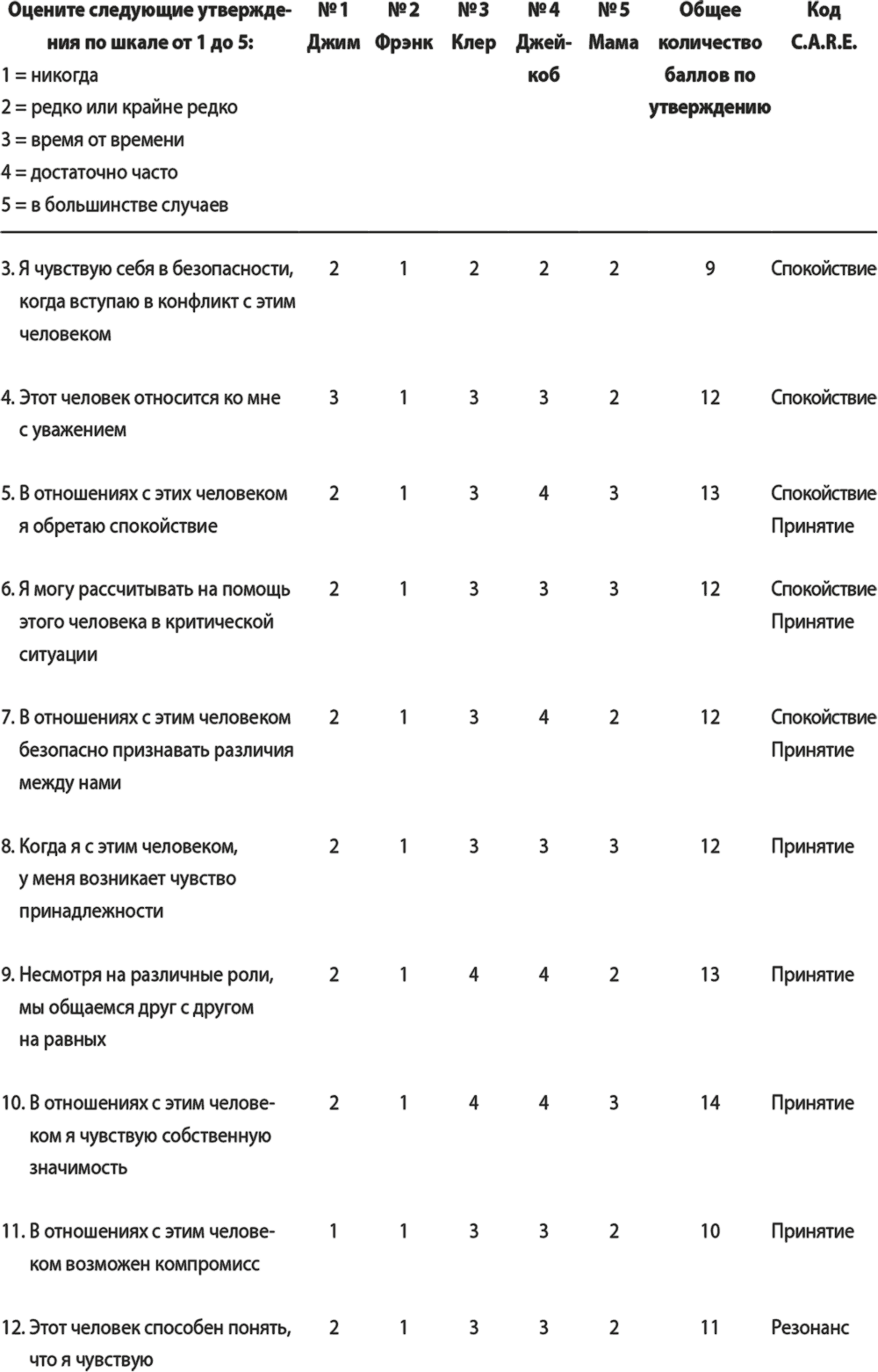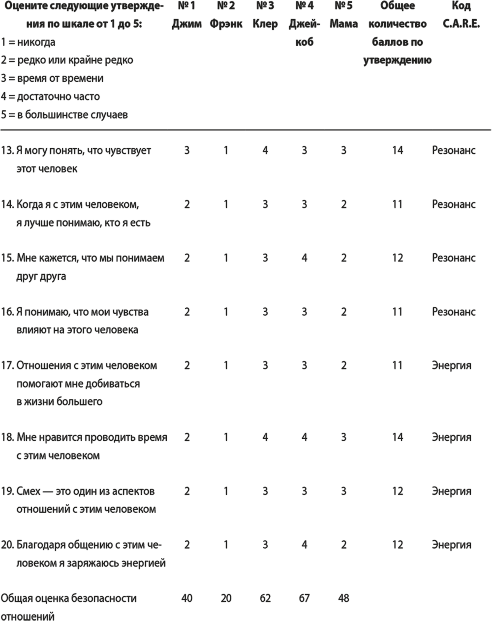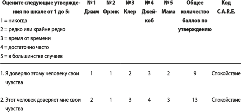 Я попросила Дженнифер расслабиться и мысленно представить себе несколько случаев взаимодействия с каждым из этих людей, обратив особое внимание на то, что она при этом чувствовала. Затем Дженнифер заполнила таблицу оценки отношений.