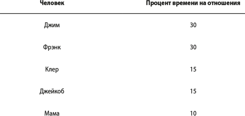 Я попросила Дженнифер представить, что на пять человек, включенных ею в таблицу, приходится все то время, которое она тратит на коммуникации, а затем определить, какой процент этого времени она проводит с каждым из них. Это полезное упражнение на воображение, которое делает существующие модели и закономерности более очевидными. Распределение времени Дженнифер выглядело следующим образом: