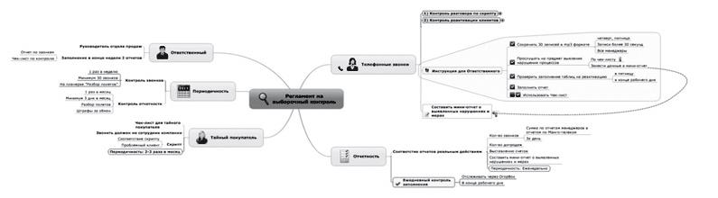 Конечно, зафиксировать инструкцию вы можете и в виде маркированного списка или, что совсем плохо, сплошным текстом. Но велика вероятность, что данный документ станет очередной «галочкой». Вы будете довольны, что инструкции есть; персонал будет делать вид, что им следует. А по факту – результаты (т. е. инструкции) трудоемкой и напряженной работы (будьте готовы, что персонал с недоумением воспримет вашу идею о пошаговых инструкциях для него) пылятся в одной из папок в шкафу с какими-нибудь другими, также нереализованными и уже давно забытыми нововведениями. Поэтому настоятельно рекомендую создавать их с помощью ментальных карт. Как это сделать, рассмотрим с помощью «Регламента на выборочный контроль».