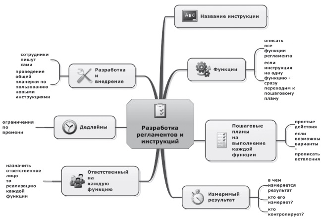 Если вы решили использовать ментальные карты в бизнесе, то я рекомендую вам начать с разработки с их помощью простых регламентов и инструкций для персонала, особенно если ментальная карта – это новый для вас формат работы, а инструкций, которые действительно соблюдаются, в вашей фирме нет. Инструкции для персонала – простая задача для разработки в формате ментальных карт.