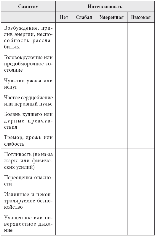 Следующее упражнение (доступное для загрузки с веб-сайта) поможет вам отследить симптомы тревоги, которые могут возникать в самых разных ситуациях, и понять, как они влияют на ваше восприятие. Просмотрите список симптомов тревоги (см. с. 46), а потом отметьте интенсивность, с которой вы испытывали каждый из них в минувшем месяце.