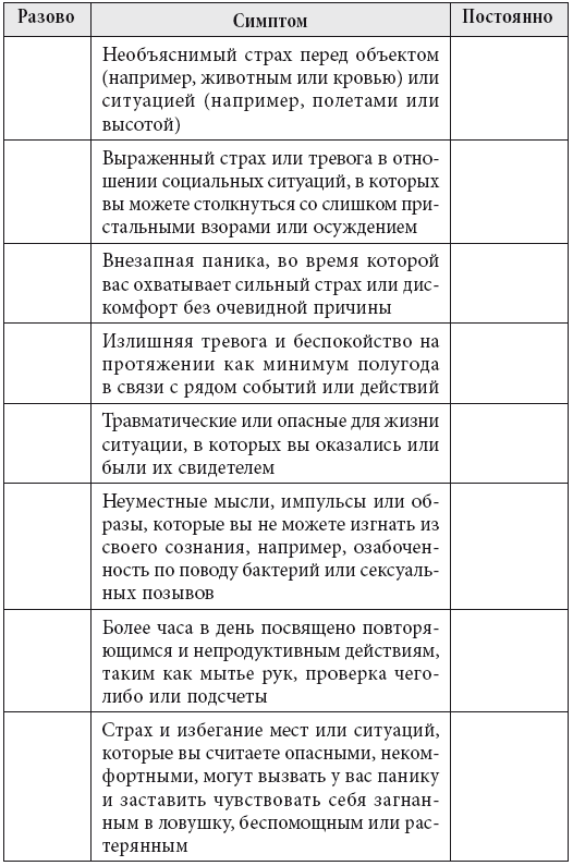Чтобы более детально изучить, как тревога влияет на ваши переживания и опыт, давайте рассмотрим разные грани тревоги. Пользуясь предложенным ниже списком, поставьте отметку слева, если вы испытывали данный симптом хотя бы раз в жизни. А справа поставьте галочку, если это ваша хроническая проблема.