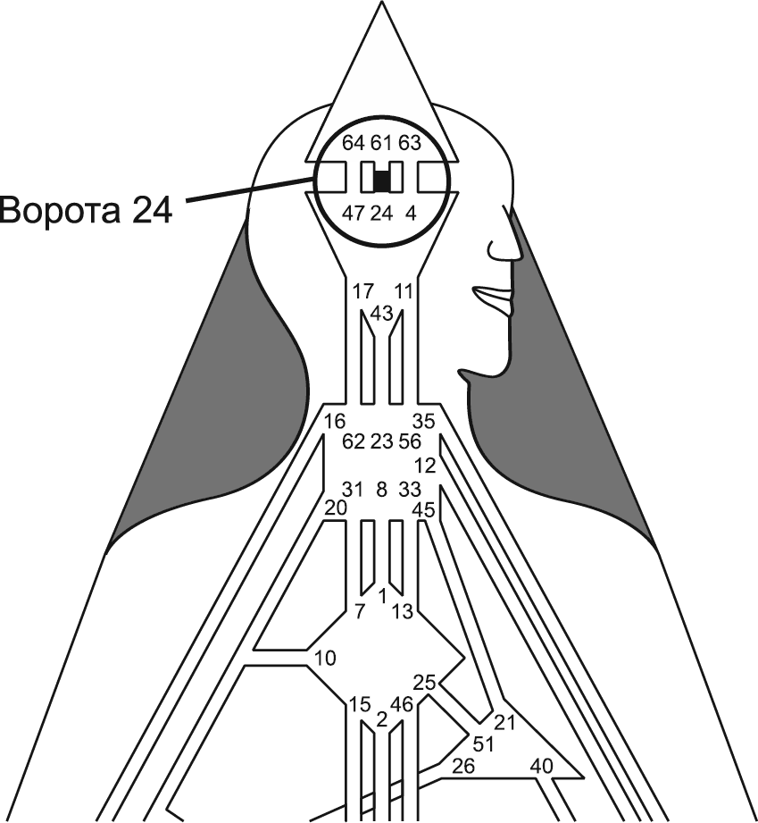 Энергия Ворот 24 (рис. 74) отвечает за рациональность. Для описания работы с ней лучше всего подойдет поговорка «Тише едешь – дальше будешь». Чем глубже изучаешь Дизайн Человека, тем очевиднее становится, что расширению всегда предшествует сжатие. Мы движемся вперед по дороге жизни, но перед каждым новым шагом замираем, собираясь с силами. Я называю это «перенастройкой». Ворота 24 обладают способностью улавливать наиболее достойные идеи в потоке информации, порожденном Воротами 61, и фокусироваться на них.