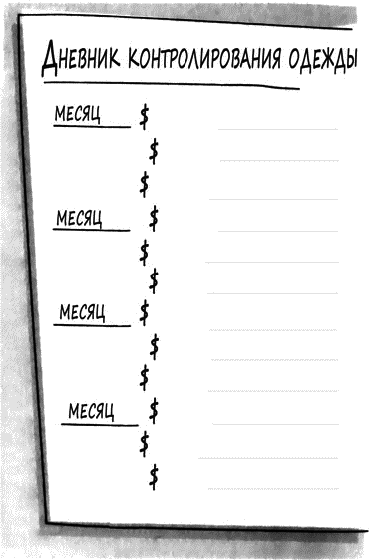 Мы предлагаем вам образец дневника: вы можете снять с него копию, а можете использовать подобный формат на последней странице ежедневника. Держите дневник поближе к кошельку, чтобы он постоянно был у вас под рукой, когда вы отправляетесь в поход по магазинам (подробнее со стратегиями покупок мы познакомимся в девятой главе).