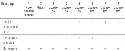 Основные параметры, которые рекомендуется принять в расчет в первую очередь, – это соответствие профессионального опыта, личностных качеств и мотивации кандидата требованиям вашего клиента. Конечно, можно увеличить количество параметров, но это повлечет за собой усложнение процесса принятия решения, при этом не обязательно сделает его более эффективным. В предлагаемой ниже таблице рассматриваются типовые комбинации упомянутых трех параметров. Ниже дан комментарий о вариантах действий в каждом случае.