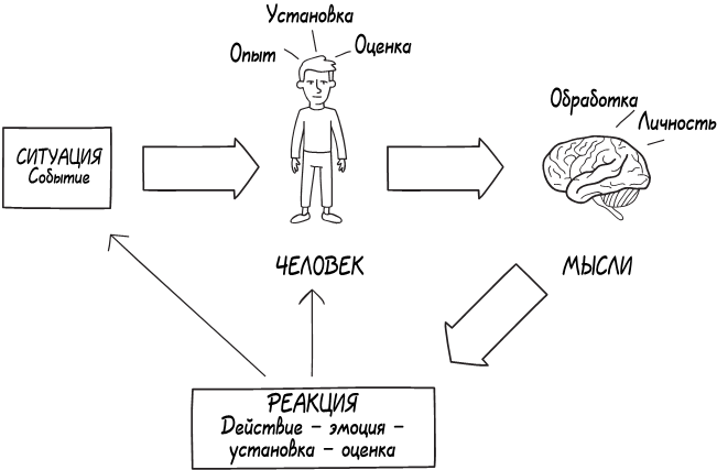 В повседневной жизни мы часто не понимаем, как мысли влияют на наш опыт и поведение. Допустим, происходит что-то непредвиденное. Мы торопимся на встречу и застреваем в пробке. Начальник предлагает выступить на совещании перед коллегами прямо сейчас и без подготовки. Кто-то грубит нам без всяких причин. В подобных ситуациях мы все ведем себя как привыкли: одни переживают из-за возможного опоздания, думают, чем не угодили начальнику, или хамят грубияну в ответ, а другие с умом пользуются временем в пробке и думают, что подарить имениннику, перекладывают ответственность за неподготовленное совещание на начальника и не обращают внимание на грубость. Реакции на события могут быть разными. Они связаны с жизненными обстоятельствами, индивидуальными особенностями человека и – ключевое – с закрепленными привычками мышления. Давайте посмотрим на простую модель, демонстрирующую мыслительный процесс.