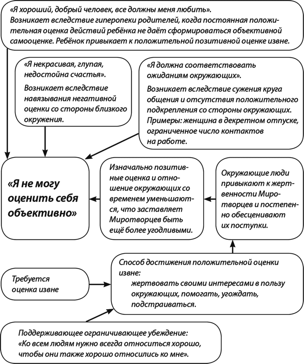 Для человека с низкой самооценкой характерен высокий уровень тревожности и недостаточно сформированный образ Я. Я-концепция Миротворца выглядит как свод незыблемых правил, которые он применяет к себе и другим. Это могут быть правила, касающиеся поведения (например, не брать взятки), отношений с людьми (делать только добро, всем помогать), морально-этических норм (ни при каких обстоятельствах не сквернословить и не повышать голос) и т. д. Когда окружающие отступают от привычных правил, это вызывает бурное осуждение со стороны Миротворца, которое на самом деле является своеобразной психологической защитой, маскирующей зависть к людям, способным нарушать правила, действовать по обстоятельствам, быть гибкими по отношению к ситуации.