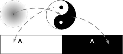 Музыкальная интерпретация, как мы уже увидели, гласит, что мир произошел от ноты Ля, от первого, отпущенного в свободное колебание звука. Еще нет никакого рояля, никакой октавы и никакой привычной нам гаммы. А есть единственная первичная нота «Ля» без всяких диезов и бемолей, единая в белой и черной клавише (рис.). Чтобы появилась октава, потребуется ряд более сложных волновых преобразований и не один пройденный эволюцией и создателем шаг.