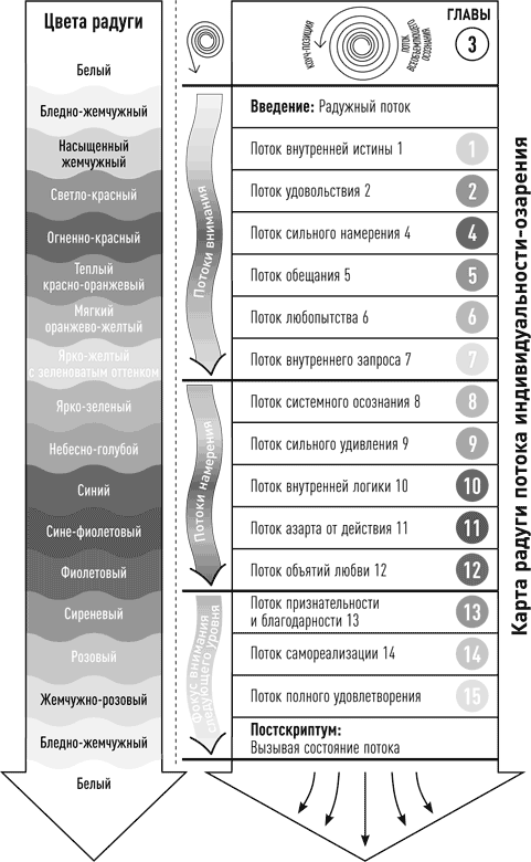 Наша цель – сделать так, чтобы вы нашли собственные потоки ценностей и испытали глубокое удовлетворение, переходя естественным образом от одного к другому по мере развития проекта. За исключением главы 3 (имеющей белый цвет), потоки внимания, описанные в главах 1–7, обозначены цветами теплого спектра, так как, ощущая их, мы накапливаем энергию. В главах 8–12 мы попадаем в течение более холодных цветов, соответствующих намерению, а затем в потоки быстрых течений и тихих заводей внедрения и завершения. Главы 13, 14 и 15 посвящены интеграции следующего уровня, благодарности, самореализации и ярко окрашенному, теплому чувству удовлетворения. Вы можете достичь этого уровня в моменты интеграции, когда мы соглашаемся, что смысл всего путешествия заключается в том, чтобы перенести в настоящее полученный опыт нахождения истины, озарения и естественной реализации. Во время нашего путешествия на каждом этапе мы испытываем всю радугу потока присутствия. Смотрите «Карту радуги потока индивидуальности-озарения», приведенную ниже, где кратко описано чередование потоков.