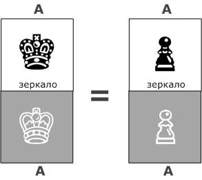 Зеркальная одномерная симметричная стартовая позиция. Посмотрите, пока еще не было сделано ни одного хода, есть только одно главное вертикальное измерение, в котором две зеркальные половинки обмениваются зеркальными действиями-взглядами. Если предположить, что шахматы символизируют эволюцию, то в стартовой ее точке еще нет никаких фигур, а есть два смотрящих друг другу в глаза Короля. Нет еще ни рядом расположенных клеток, ни плоскости доски, ни нескольких измерений. Король, не породивший еще своей армии фигур и не имеющий возможности ходить, равен пешке, родившейся из пустоты. Есть только одно измерение и возможность видеть свое отражение в зеркале.