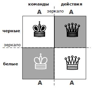 Но есть еще одно интереснейшее свойство шахмат – это симметрия фигур во втором, горизонтальном направлении. Фигуры, выстроившиеся слева и справа от вертикальной оси – симметричны! Ну, почти симметричны, за исключением Пары Король-Ферзь.