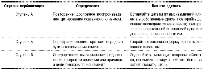 Вербализуя чувства клиента, начинайте со следующих слов: «Вероятно, вы чувствуете… Не чувствуете ли вы себя несколько… Мне показалось, что вы… Может, вам… Похоже, вы… Мне кажется, вы… Я почувствовал, что… Интуиция мне подсказывает, что… Я чувствую, что… В ваших словах я ощутил… Если я не ошибаюсь, вы чувствуете…»