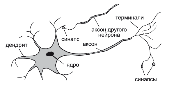 Итак, нейрон — это клетка, маленький чёрный ящик. Тело нейрона не представляет особого интереса — обычная такая клеточка, с ядром, цитоплазмой и прочей матчастью. Куда интереснее то, что из этой клетки растёт (рис. 2.1).