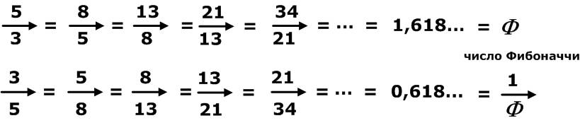 Мистика? Нет. Это самое настоящее проявление того самого Божественного начала! Как и само число «Фи», такая последовательность определяет не только Золотую пропорцию, но и шаги, которыми выполняется любое развитие, начиная с момента его старта. То, что второй член этого ряда не отличается от первого, говорит, что на первом шаге пока еще нет стартовавшего развития, а есть шаг по разделению полярностей. Один плюс один равно два. А вот, начиная со следующего шага, стартует развитие, и каждые два числа, два предыдущих состояния полярностей складываются и порождают новое число