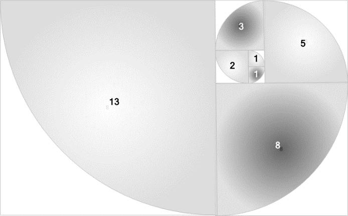 Существует несколько эффектных геометрических интерпретаций Ряда Золотого сечения. Например – увеличивающийся квадрат, где площадь каждого нового квадрата равна следующему числу ряда Золотого сечения. Или “Улитка» – увеличивающаяся спираль, где каждый следующий радиус равен следующему числу ряда Золотого сечения.