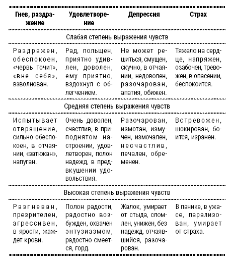 Определяйте ведущую модальность чувств клиента и степень их выраженности с помощью таблицы, приведенной на следующей странице.