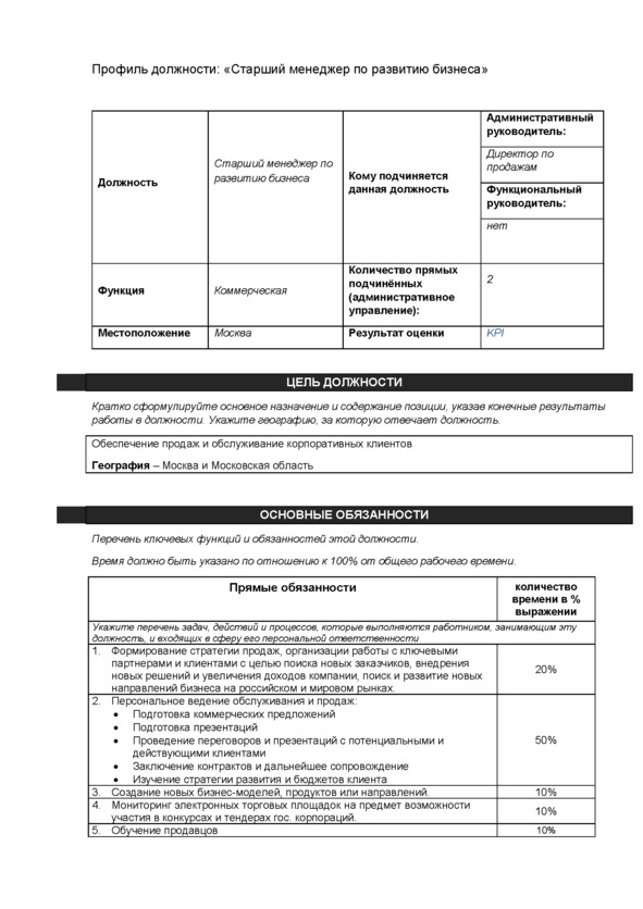 Далее я приведу три примера описания профилей по следующим позициям: старший менеджер по развитию бизнеса, региональный менеджер, продакт-менеджер. Они отличаются по форме, но все представленные профили содержат как обязательные, так и желательные требования к кандидатам. Именно обязательные требования и составляют основные критерии отбора при скрининге резюме.
