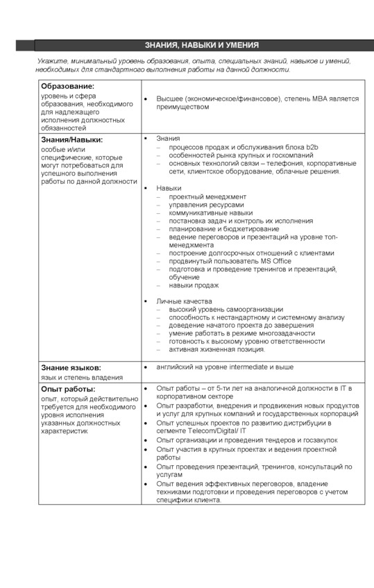 b) Обязательные требования: образование, опыт работы, уровень заработной платы, знание иностранных языков, наличие водительских прав и автомобиля, уровень владения ПК и т. д.