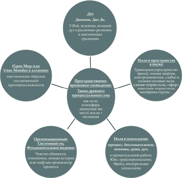 Пространственно-временное сновидение процессуального ума включает в себя все эти предыдущие термины и выходит за их пределы, распространяясь на пространства всей вселенной. Как показывает приводимая ниже схема, это междисциплинарное понятие, которое пытается объединить многие области (см. рисунок 60).