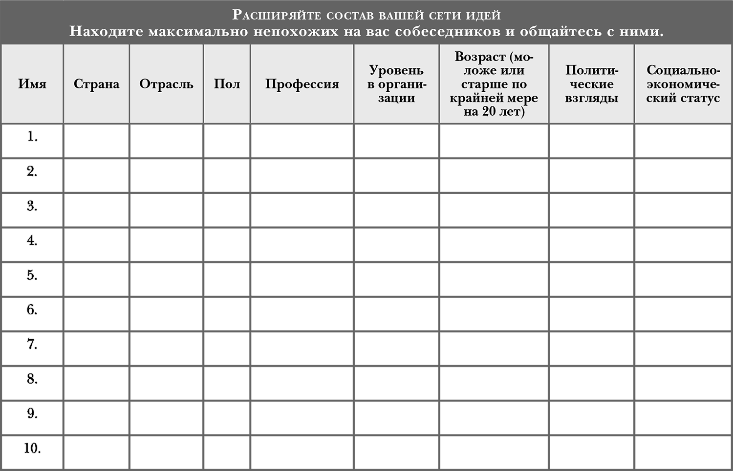 Составьте список из десяти человек, к которым вы обратились бы за новыми идеями или советами по их доработке. Приступайте прямо сейчас. У скольких из них опыт и точки зрения существенно отличаются от ваших? К примеру, сколько из них тинейджеров, а скольким уже за семьдесят пять? Многие ли из них родились и выросли в другой стране? Кто относится к совершенно иной социально-экономической прослойке? Если ваш нынешний круг не очень обширен и представителен, увеличивайте ваш пул идей – находите контакты и устраивайте встречи с теми, кто наиболее далек от вас в одном или всех аспектах, перечисленных в таблице 5-1.