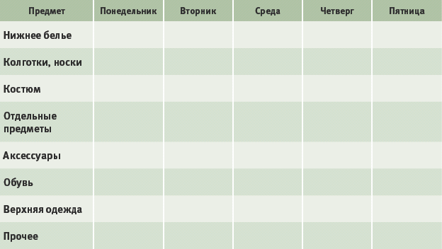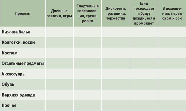 Если ребенок собирается в поездку, очень полезны табличные формы составления списков. Это могут быть хроносовые таблицы (привязанные к времени) или кайросовые (контекстные, привязанные к обстоятельствам) таблицы (см. табл. 7 и 8). Хроносовая таблица полезна, когда поездка короткая и четко известна программа пребывания. Например, ребенок едет с вами в деловую поездку, и пока вы занимаетесь делами, ребенок гуляет или ездит на экскурсии.