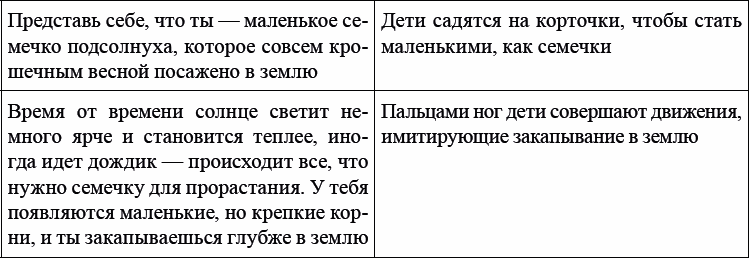 Ложитесь удобно на спину, на свои коврики. Расстегните пуговицы или ремни, которые вам могут мешать расслабиться. Снимите очки. (Тренер выдерживает небольшую паузу, для того чтобы дети могли приготовиться к упражнению.) Закройте глаза сейчас или сделаете это немного позже. Тот, кто не хочет закрывать глаза, может смотреть на потолок. (Пауза.) Теперь закройте глаза, и пусть звуки, которые вы слышите с улицы сейчас или можете услышать позже, помогут вам расслабиться быстрее, легче и глубже.