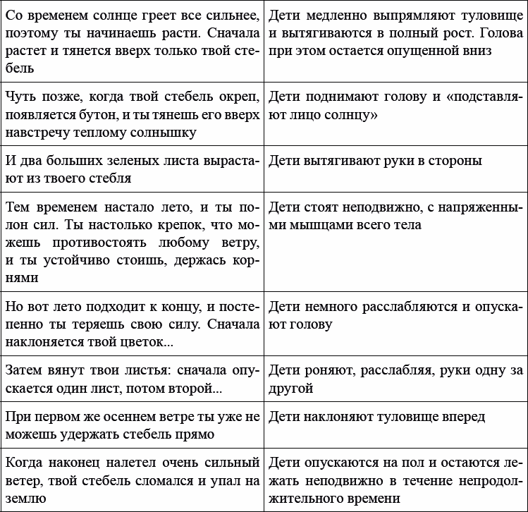 1. Дети продолжают заниматься аутогенной тренировкой, используя четыре основных формулы («я абсолютно спокоен и расслаблен»; «мои руки и ноги совершенно тяжелые»; «мои руки и ноги теплые»; «мое дыхание ровное и спокойное»), но обязательно каждый раз меняя позу – сначала они лежат, затем сидят в кресле или на стуле, затем пробуют делать это стоя. Задача детей – научиться достигать результата в любых условиях, там, где нет удобной кровати или кресла, а есть только негативный раздражитель.