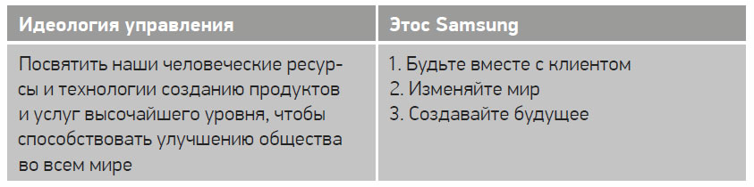 Samsung начала менять корпоративную культуру. Компании требовалось переосмыслить свою конформистскую и целостную культуру и разработать более современную и динамичную идеологию, в рамках которой управленцы и сотрудники могли бы получить значительную степень автономии. Для этого было радикально реформировано высшее руководящее звено, включая изменение роли председателя и секретариата – часть их полномочий делегировали руководителям аффилированных структур. Такие изменения позволили Samsung перейти к системе поощрения независимости и индивидуальности работников, основанной на убеждении в том, что «хорошие продукты делаются руками наших сотрудников и партнеров». В то же время в Samsung изменили рабочую обстановку; она стала более благоприятной и отражала преимущества новой системы. В марте 1993 года, на пятую годовщину «Второго Основания», Ли анонсировал новую идеологию Samsung и ее идеальную сущность, дух и моральные ценности (то, что можно выразить словом «этос»), которые соответствовали изменившимся требованиям времени, как это показано в таблице 2.2.