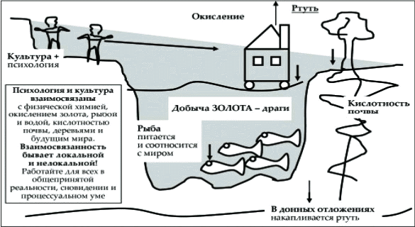 На рисунке 48 вы видите двух разговаривающих людей. Скажем, в их отношениях возникло напряжение, поскольку у них мало денег. «Что нам делать? Нам нужны деньги!» Или, возможно, они просто становятся жадными по другим причинам. Напряженность их отношений может быть связана с нажимом: «Давай достанем золота». Индивидуальные процессы и процесс отношений связаны с выбросом ядовитой ртути в окружающую среду. Их человеческий процесс отношений взаимосвязан (или сцеплен) с процессами в атмосфере, в деревьях, в почве, в донных отложениях и на всей земле.