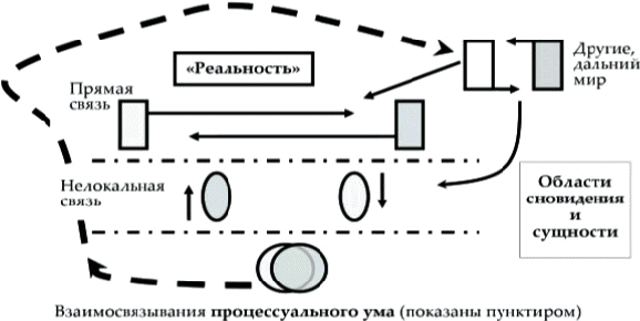 Рис. 49. Процессуальный ум помогает иметь дело с нелокальными взаимосвязанностями; реальные люди (или прямоугольники) устанавливают связь в общепринятой реальности и в сновидении (как овалы) с процессуальным умом (круг)