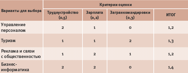 4. Ставим оценки каждому варианту. Например, возможность трудоустройства со специальностью «управление персоналом» высокая, оцениваем ее на 2 балла; потенциальная зарплата приемлемая – 1 балл. Зато вряд ли предстоят путешествия, ставим оценку 0. По такому же принципу оцениваем все варианты.