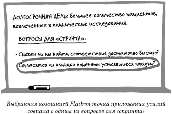 Выбрав эту точку, еще раз взгляните на исходные вопросы, которые планировалось решить. Как правило, ответить на все вопросы в рамках одного «спринта» невозможно. Однако по нашему опыту один или два из них обычно коррелируют с только что выбранной точкой приложения усилий. Например, во время «спринта» в компании FlatIron эта точка (координаторы, осуществляющие поиск пациентов для участия в клинических испытаниях) была связана с вопросом «Согласятся ли клиники поменять устоявшиеся порядки?». Мы надеялись получить ответ на него по итогам тестирования прототипа нашего будущего решения с привлечением реальных координаторов.