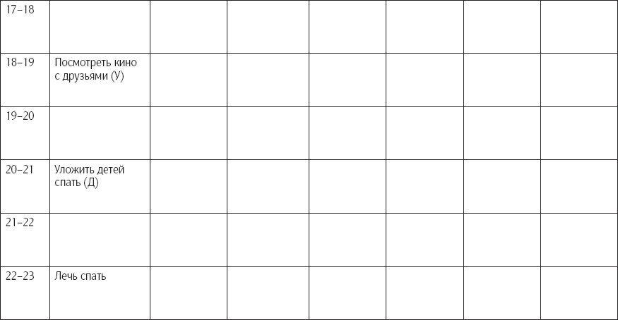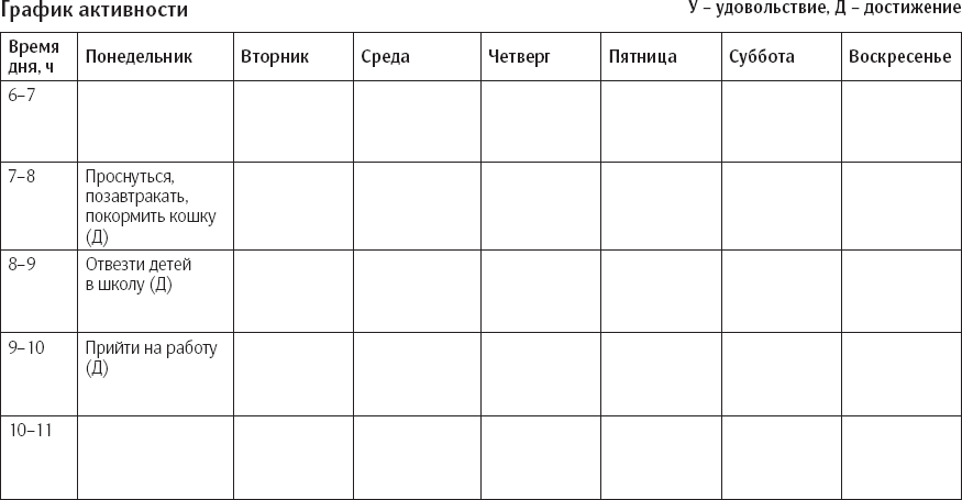 Один из испытанных и проверенных методов в КПТ – попытаться помочь людям сдвинуться с места. Даже самое маленькое движение вперед уже хорошо. КПТ призывает вас к тому, чтобы расписать свою неделю, час за часом, и в конце каждого часа точно фиксировать, что вы сделали, самое простое: приготовили себе чашку чая, покормили птиц, выбросили мусор, сходили в магазин на углу улицы, вымыли голову. Поскольку каждое из этих действий может казаться не менее трудным, чем восхождение на Эверест, очень важно хвалить себя каждый раз, когда вы хоть что-нибудь сделаете. Итак, записывать то, что вы делаете, – это первый шаг к обузданию вашего плохого настроения.