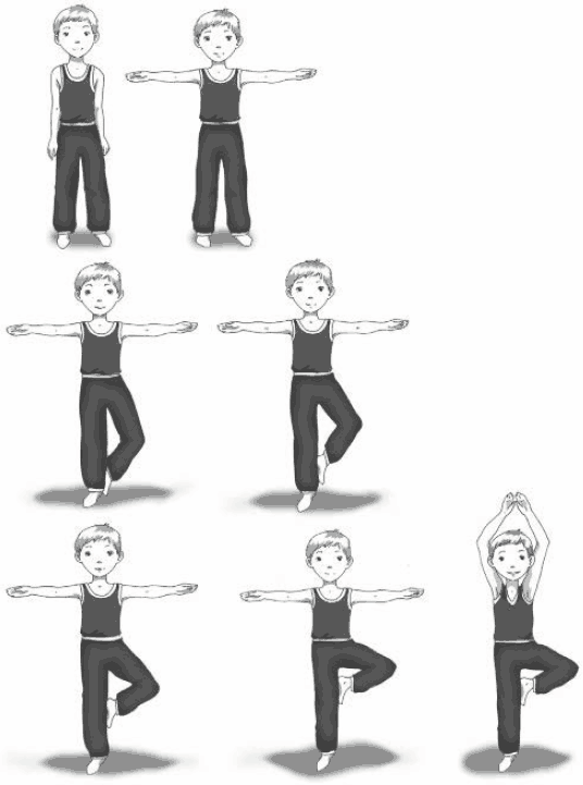 A. Исходное положение: дети встают на расстоянии вытянутых рук друг от друга; ноги на ширине плеч, руки опущены. Вес переносят на правую ногу: правая нога – это ствол дерева, а ступни – корни, вросшие в землю. Дети смотрят на определенную точку на стене или на предмет, расположенный на уровне глаз.