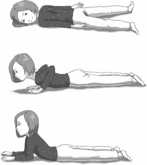 В. На вдохе поднимают голову и верхнюю часть туловища и передвигают руки вперед, опираясь на ладони и локти, так чтобы образовался прямой угол между плечом и предплечьем. Тренер следит за тем, чтобы плечи в этом положении дети не подтягивали вверх к ушам, а живот (центральная часть, где расположен пупок) оставался прижатым (но не сильно) к полу.