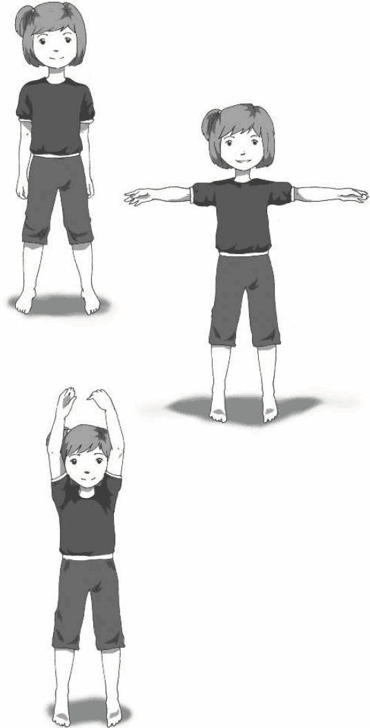 Г. Стоя в предыдущей позиции, дети медленно поднимают руки через стороны вверх и соединяют ладони над головой. В этой позиции они стоят как можно дольше и медленно, плавно дышат.