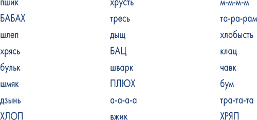 Допустим, вы сейчас пишете приключенческий рассказ. Ваш мозговитый герой висит на краю скалы, держась за последнюю веточку тощего деревца… и тут ХРУСТЬ! Вдалеке плохие парни, того и гляди, ВЖИК и скроются из вида. Но подождите, это же ваш герой, он рванул за ними! Он упал, но выжил. Его не расплющило. Весь город кричит: «Ура!» Ваш герой краснеет и бормочет: «Да ладно, чего там», и машет своим поклонникам. Когда вам понадобятся слова, которые имитируют звук, шум или действие того, что они обозначают, просто посмотрите в этот список, чтобы добавить в текст щепотку перца.