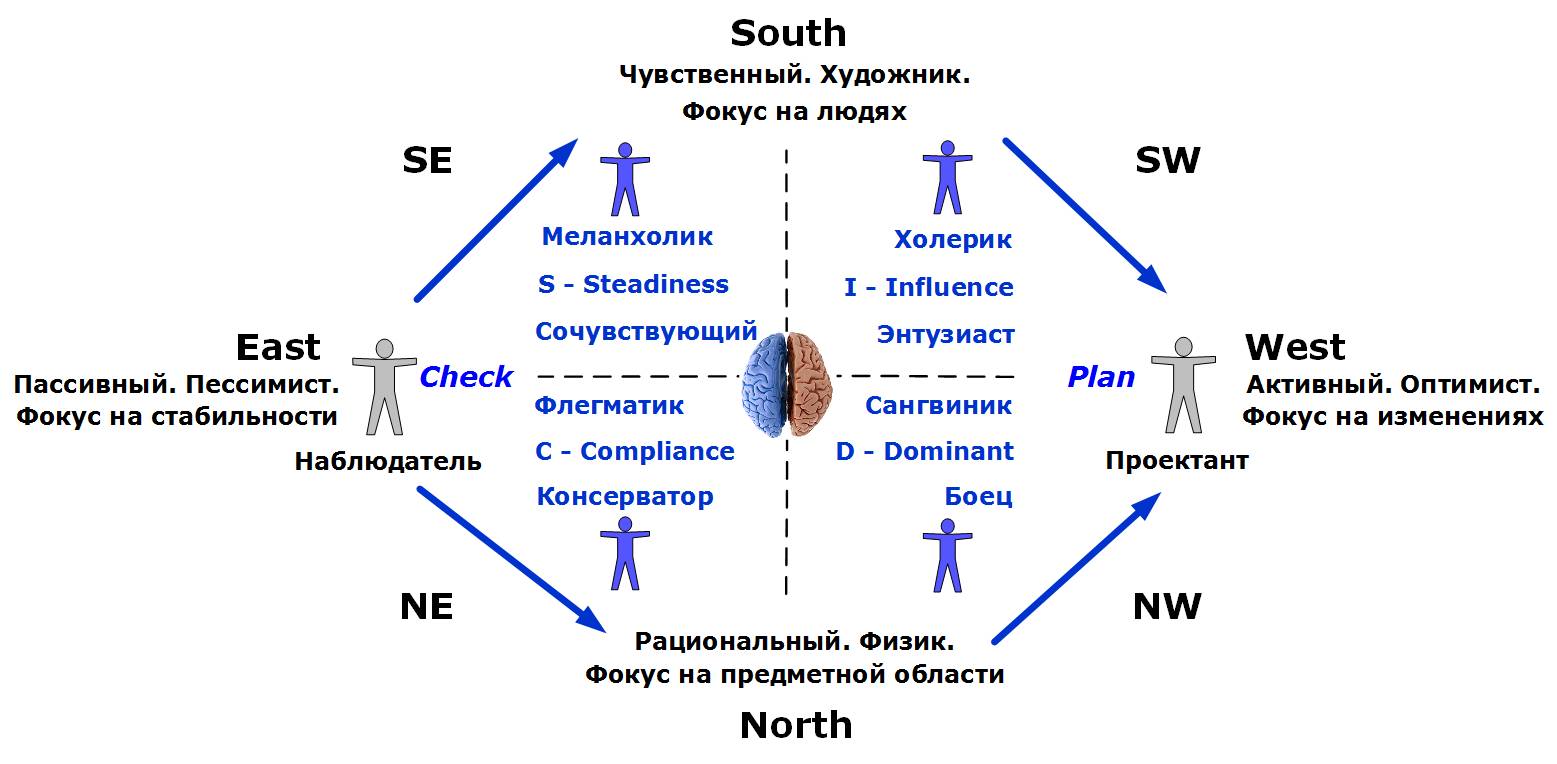 Если проводить аналогию Компаса, а она здесь просто лежит на поверхности, то обнаруженные в процессном цикле PDCA, «наблюдатель» и «проектант», в точности соответствуют направлениям «восток» и «запад». А четыре общеизвестных психотипа ложатся не строго по осям, а по диагоналям. «Боец» – северо-запад, Энтузиаст – «юго-запад», Сочувствующий – «юго-восток», Консерватор – «северо-запад».