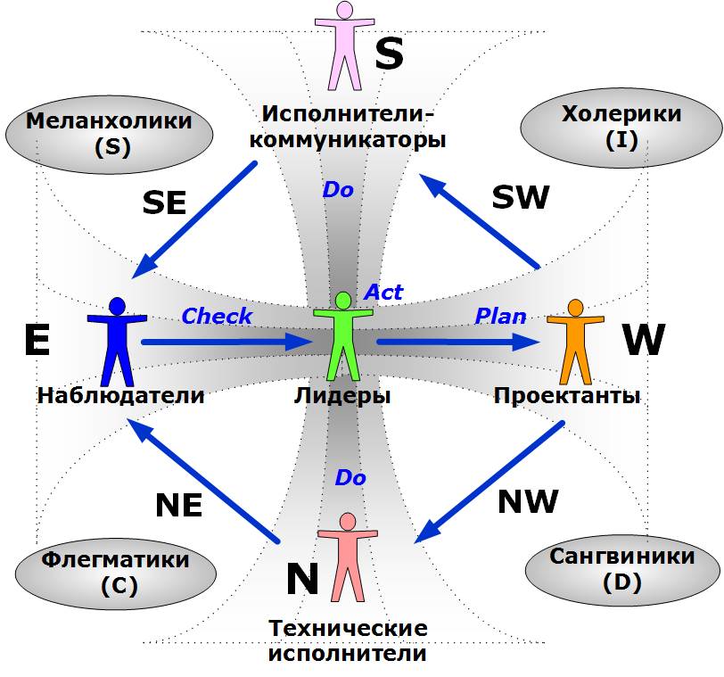 Рис. Совмещение цикла PDCA с известными психотипами людей